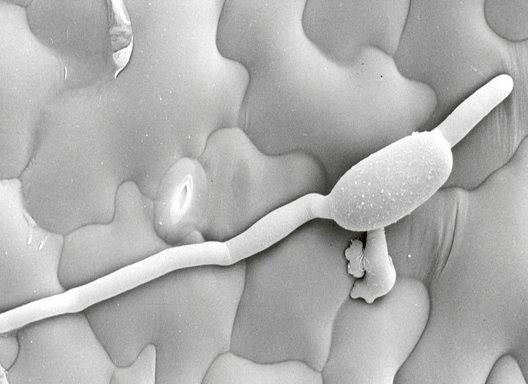 Electron microscopy image showing the fungus (causing powdery mildew disease) developing on the leaf surface of a host (Arabidopsis) plant.