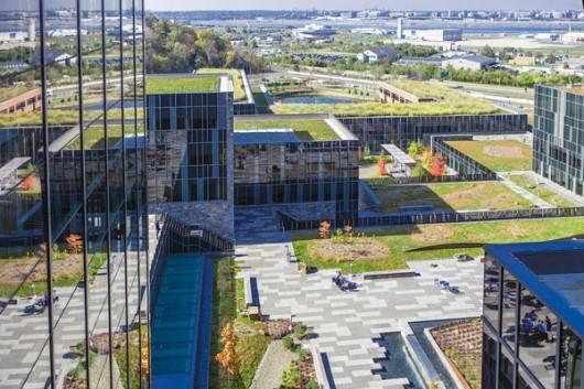 Imagine rising in a translucent elevator above a wooded, stone courtyard when suddenly a bald eagle swoops by, carefully watching for its prey. Imagine walking onto a green roof and disturbing a napping doe, which promptly leaps safely to the ground. Imagine looking up from a babbling fountain surrounded by yellow flowers to see and hear a screeching red tailed hawk. These almost primal experiences in the built environment are characteristic of the new U.S. Coast Guard Headquarters in Washington, D.C. The landscape encourages these experiences through its incorporation of vegetation from different Maryland regions, like the Coastal Plain, Piedmont, and Blue Ridge.