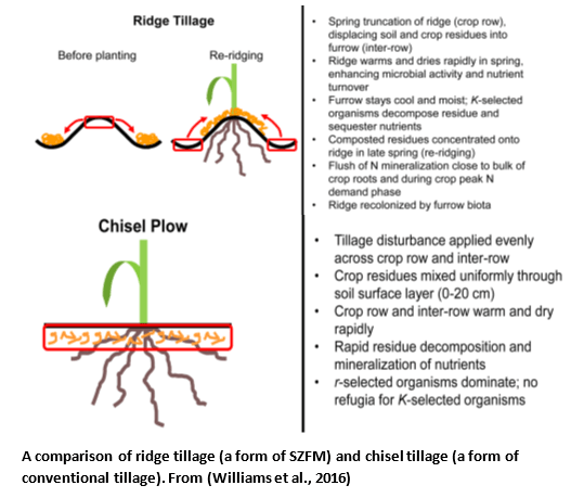 After two years of research, Dr. Williams has already found positive effects of SZFM. In his study, ridge tillage increased soil organic carbon and mobilized nitrogen (N) with no significant loss of corn yield (Williams et al., 2017). Specifically, he found that plant-available N in ridged rows was greater than in inter-rows. This result was the opposite of what he found in conventional tillage systems. Therefore, SZFM may enhance plant nutrient availability when the crop needs it most. Ecological soil building processes, particularly soil organic carbon accumulation, often take many years to significantly enhance soil health. It will be interesting to see his results after another few years! He noted in his presentation that this research was conducted in corn and soy fields and recommends more research on SZFM in other cropping systems. Dr. Williams’ ecological approach to farm management is exciting and can help us build a more holistic approach to addressing tough questions about the global food supply.