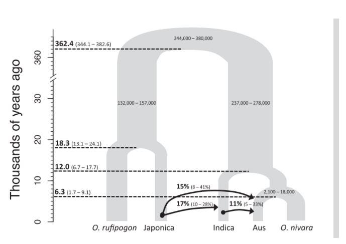 Figure 1: G-PhoCS estimated demographic model for Asian rice complex. Arrows are labeled with median and 95% HPD for the total migration rate estimates. From (Jae young Choi et al., 2017)