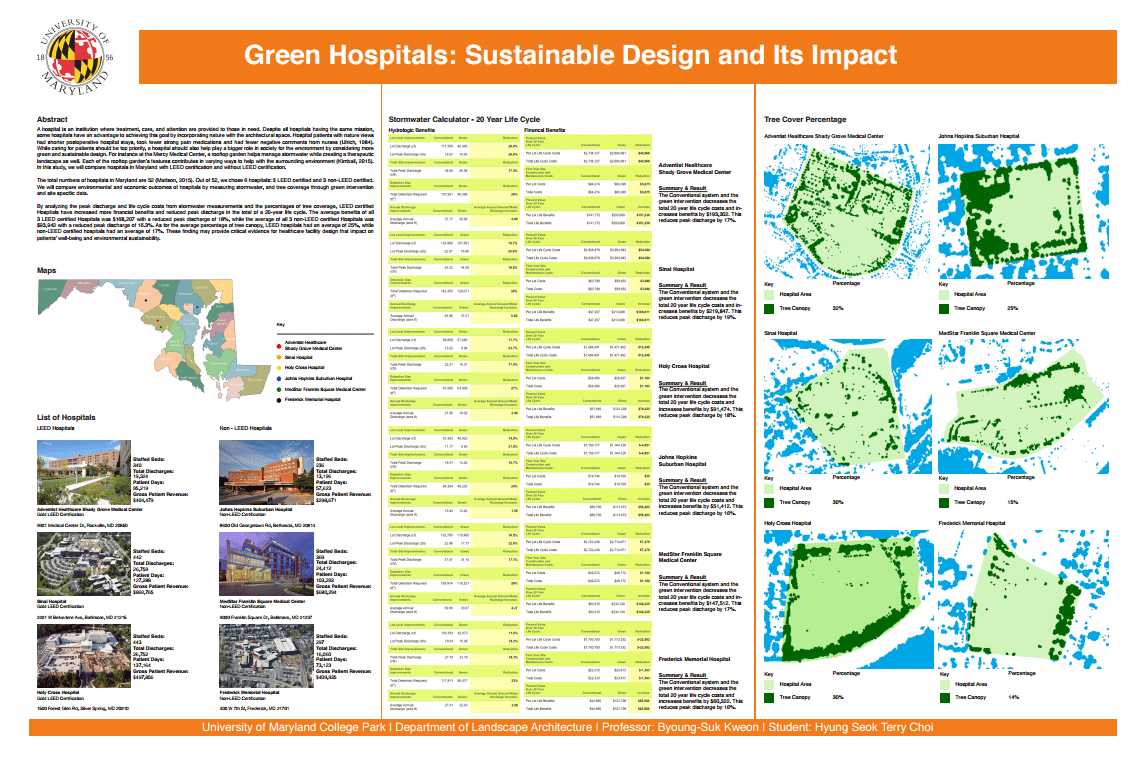 "A hospital is an institution where treatment, care, and attention are provided to those in need. Despite all hospitals having the same mission, some hospitals have an advantage to achieving this goal by incorporating nature with the architectural space. Hospital patients with nature views had shorter postoperative hospital stays, took fewer strong pain medications and had fewer negative comments from nurses (Ulrich, 1984). While caring for patients should be top priority, a hospital should also help play a bigger role in society for the environment by considering more green and sustainable design. For instance at the Mercy Medical Center, a rooftop garden helps manage stormwater while creating a therapeutic landscape as well. Each of the rooftop garden’s features contributes in varying ways to help with the surrounding environment (Kimball, 2015). In this study, we will compare hospitals in Maryland with LEED certification and without LEED certification. The total numbers of hospitals in Maryland are 52 (Mattson, 2015). Out of 52, we chose 6 hospitals: 3 LEED certified and 3 non-LEED certified. We will compare environmental and economic outcomes of hospitals by measuring stormwater, and tree coverage through green intervention and site specific data. By analyzing the peak discharge and life cycle costs from stormwater measurements and the percentages of tree coverage, LEED certified Hospitals have increased more financial benefits and reduced peak discharge in the total of a 20-year life cycle. The average benefits of all 3 LEED certified Hospitals was $168,207 with a reduced peak discharge of 18%, while the average of all 3 non-LEED certified Hospitals was $93,942 with a reduced peak discharge of 16.3%. As for the average percentage of tree canopy, LEED hospitals had an average of 25%, while non-LEED certified hospitals had an average of 17%. These finding may provide critical evidence for healthcare facility design that impact on patients’ well-being and environmental sustainability."