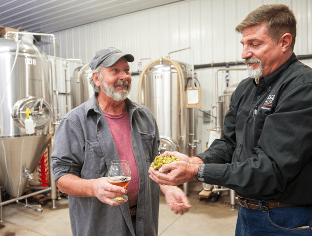 In farmer Tom Barse’s Mt. Airy brewery, he and Bryan Butler, Carroll County extension agent, show off a handful of hops grown at the Western Maryland Research and Education Center.