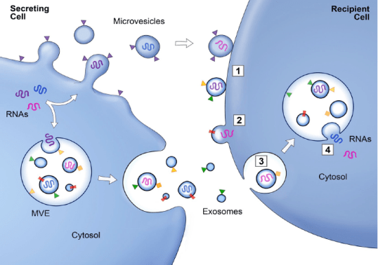 Figure: RNAs and proteins transfer by EVs (Source: Raposo & Stroovagel, 2013)