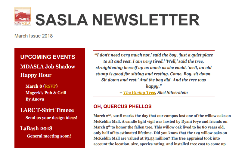 Read the latest (and previous) version of the SASLA Newsletter in the Student Chapter of the American Society of Landscape Architecture (SASLA) page on our website! Learn about the exciting things going on in studio!