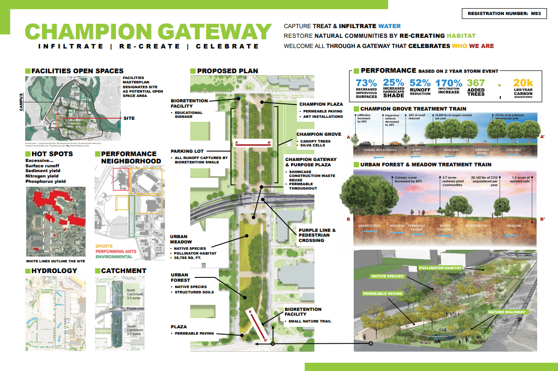 "The Champion Gateway design integrated multiple green infrastructure practices into a campus entryway and pedestrian corridor adjacent to the proposed Purple Line, a light rail system that will connect Metro service lines and bring increased foot traffic to the University. The team’s design decreases impervious surface by over 70 percent and increases tree canopy by planting over 350 new trees. The redesigned site provides environmental and aesthetic value to College Park, and highlights the wisdom of aligning transportation and water infrastructure planning." (2017 Campus RainWorks Challenge)